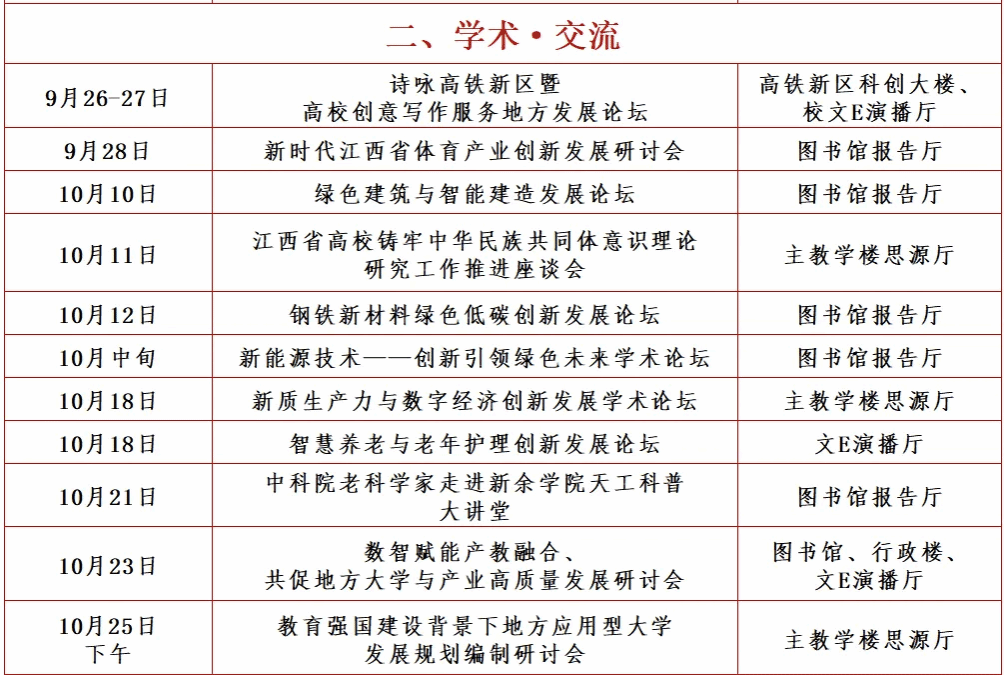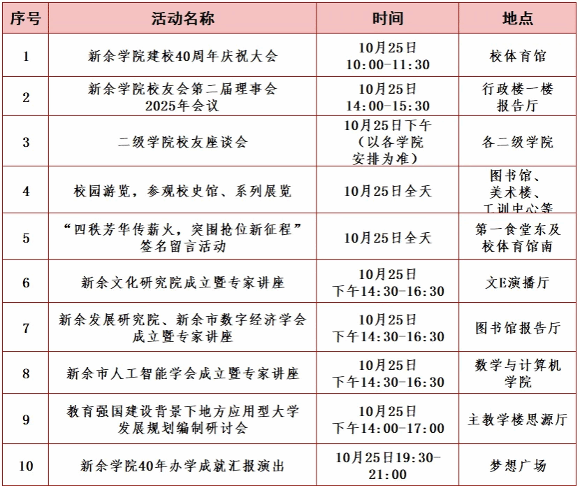 校庆期间,我们将本着“隆重、热烈、简朴、务实”的原则,以人文校庆、学术校庆、员工校庆、发展校庆为定位,举办一系列以师生员工为主体、回归育人本真、面向未来发展的学术、文体及员工活动。校庆月(9月-10月)系列活动安排详见附件1,校庆日(10月25日)主要活动安排详见附件2。真诚邀请海内外员工重返母校,共叙情谊,共谋发展,共创新院美好未来!