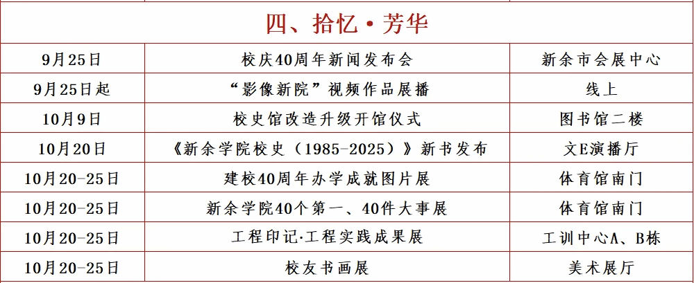 40周年校庆既是学校发展史上的重要里程碑,也是学校凝聚各方力量、共绘未来蓝图的重要时刻。我们热忱欢迎广大员工、企事业单位、社会团体以及海内外各界人士为学校发展自愿倾情襄助。资金捐赠可通过新余市慈善总会转捐(户名:新余市慈善总会,账号:1505205719200056948,开户行:中国工商银行新余城北支行);实物捐赠及其他捐赠可与学校资产管理处王老师联系(电话:13907907707) ,或与各二级学院老师联系。