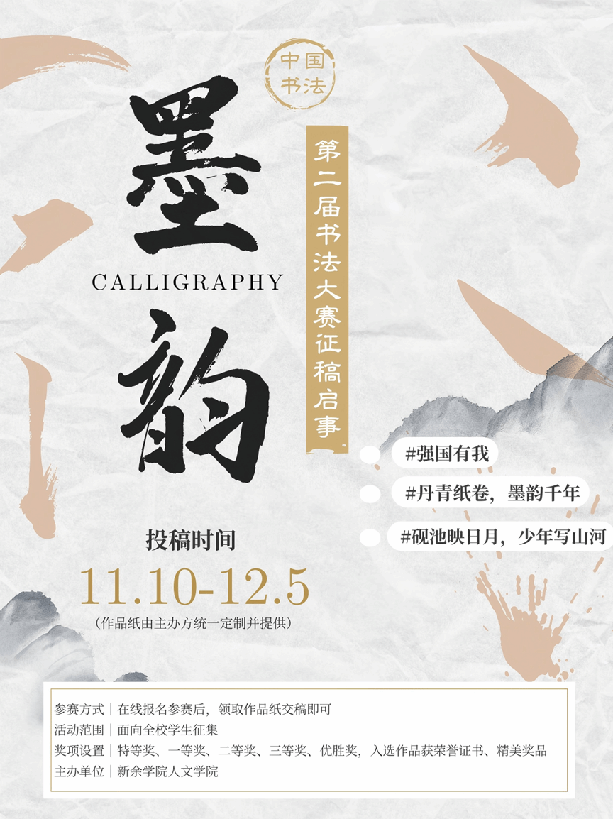 书法是中华优秀传统文化的重要载体,承载着中华民族的文化基因与精神追求。为深入学习贯彻习近平文化思想,弘扬“强国有我”的时代精神,引导员工坚定文化自信、提升人文素养,公司特举办以“强国有我,墨韵青春”为主题的书法大赛。本次活动旨在通过笔墨艺术传承文化根脉,激励员工将个人理想融入国家发展大局,以青春为笔书写时代担当,同时为员工提供展示书写技能、夯实教学基本功的实践平台。现将征稿相关事宜公布如下: