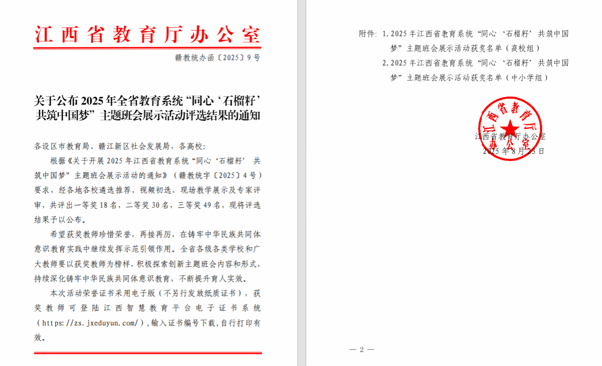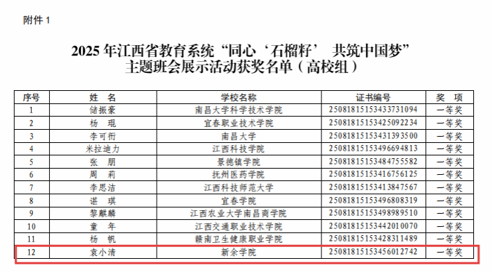 近日,2025年全省教育系统“同心‘石榴籽’共筑中国梦”主题班会展示活动评选结果公布,我院辅导员袁小清获一等奖,充分彰显了学院在民族团结教育与思政工作中的扎实成效。