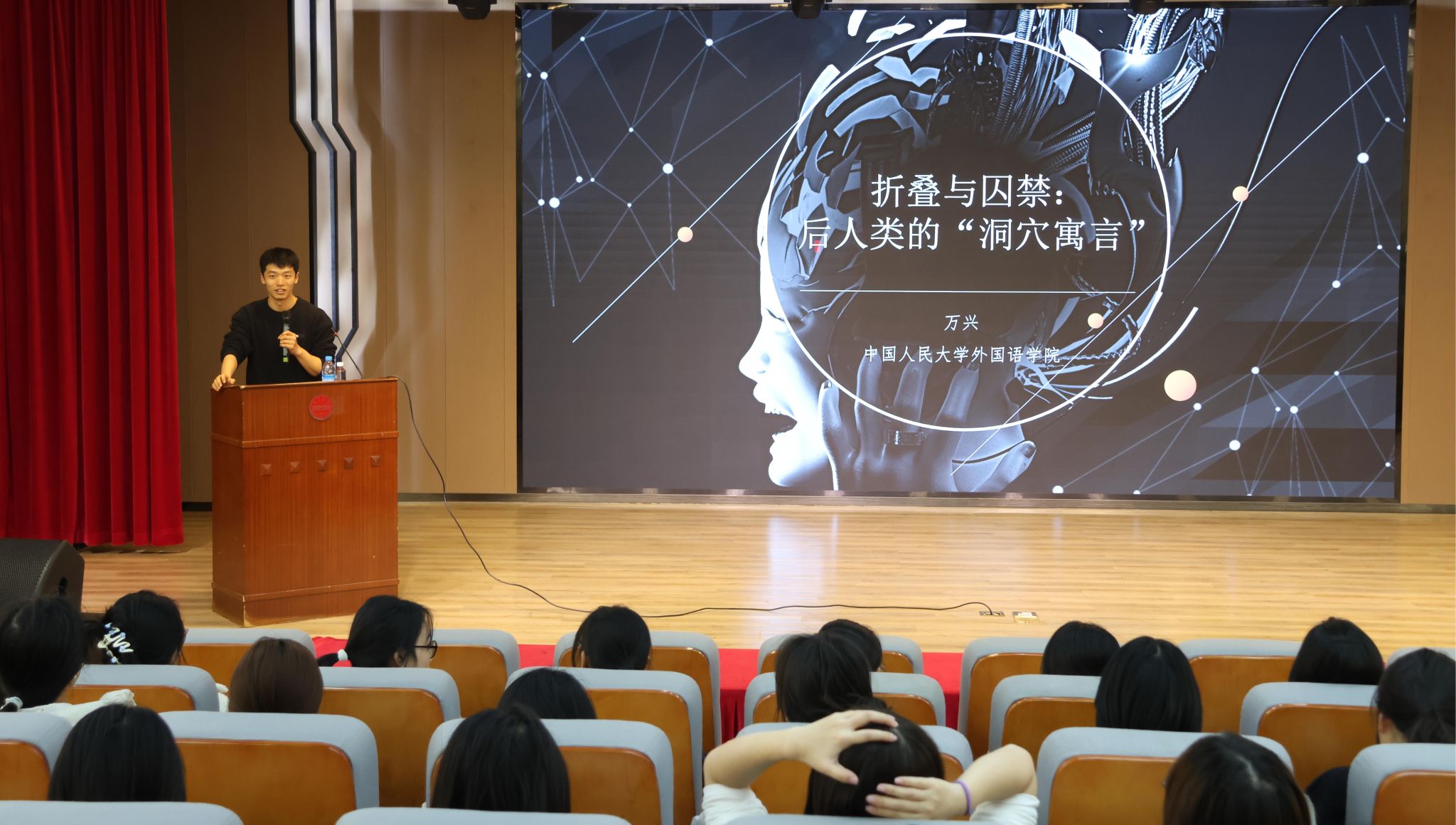2025年12月2日下午,应星书院学术品牌应星讲堂第一期在文E演播厅正式开讲。本期活动特邀中国人民大学外国语学院博士后万兴博士担任主讲,围绕“科幻电影中的空间隐喻与生存困境”展开深度分享。现场吸引了逾百名员工积极参与,部分教师亦全程聆听,师生共同开启了一场贯通哲学、影像与现实的思辨对话。