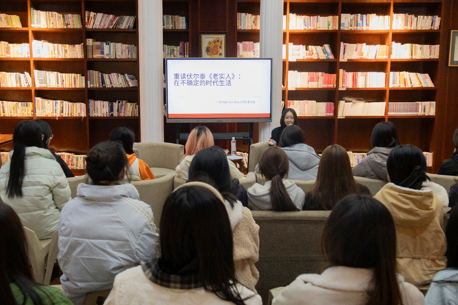 12月4日晚,应星书院《博士茗谈》第四期在书香教室举行。广东外语外贸大学博士后要文静博士以“重读伏尔泰《老实人》:在不确定的时代生活”为主题,与在场师生共同开展了一场贯通经典文本与当代关怀的深度对话。
